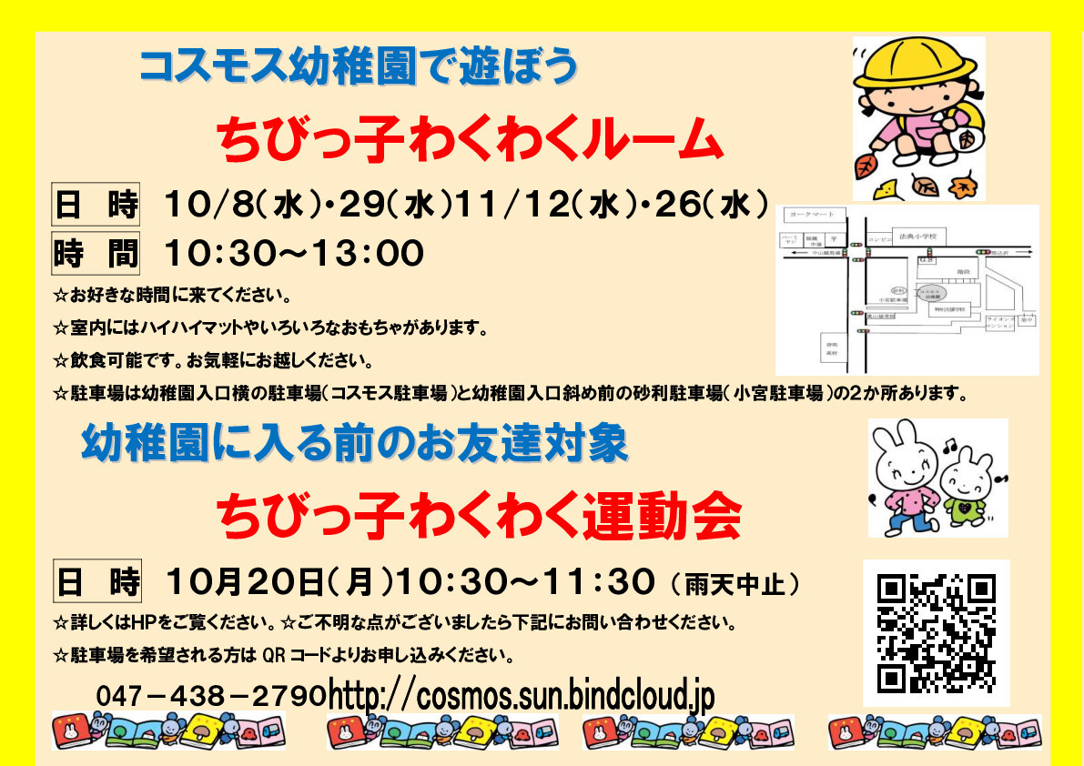 馬込方面からお越しの場合は木下街道法典小学校前の、ガソリンスタンドを左折後300m位です。10m先右側に駐車場があります、黄色いコスモスの表示の場所にお願いします。幼稚園入り口隣に駐車場を作りました、こちらにもどうぞ。