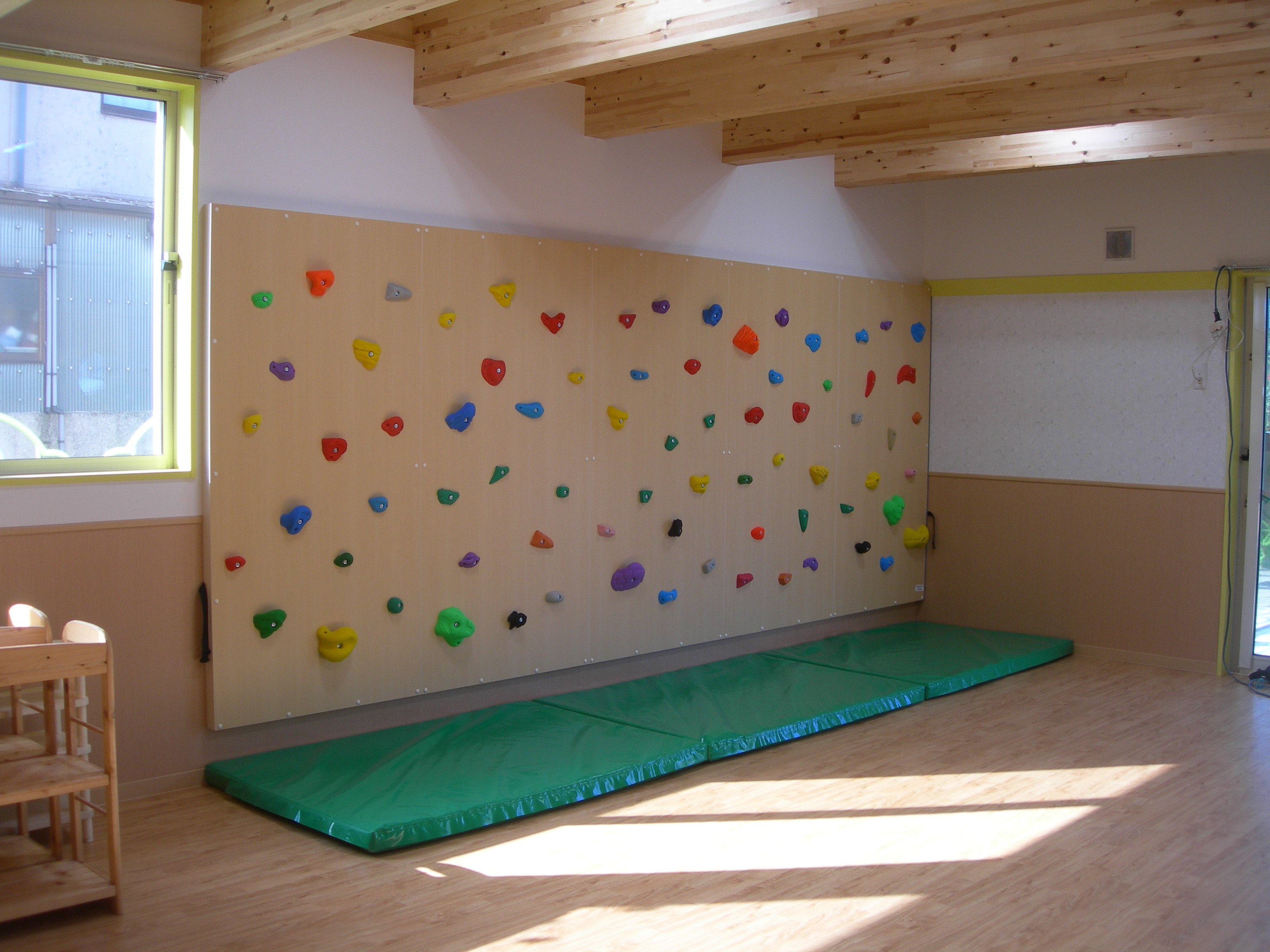 預かり保育室にクライミングウォールを設置しました。手と足を使って登ったり、横移動して思い切り楽しめますよ。